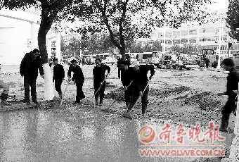 2日,在湖滨大道人行道东风路段,工人们正将水泥等材料铺在路面上。湖滨大道原有人行道方砖单块面积较大,因车辆反复碾轧等原因,方砖破损、松动、下陷较严重,改造将拆除原有方砖及结构层,重新铺设新方砖。改造预计于11月25日竣工。