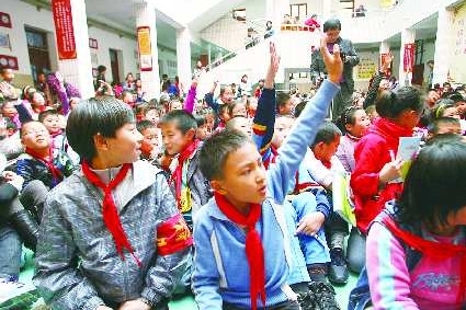 2日下午2点,在烟台工人子女小学教学楼大厅内,学生们坐满了整个大厅。