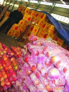 3日下午,堤口路果品批发市场内,正是苹果大量上市的时候,大批苹果摆放在交易区。与大部分苹果装箱销售不同,西侧的一个大棚内,几家批发商的货直接装在红色塑料袋内并堆放在地上。