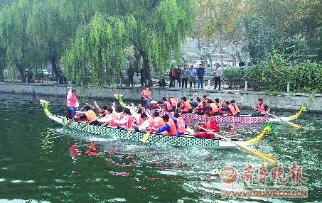 3日上午,工商河成丰桥段热闹非凡。来自山东交通学院和山东科技大学的两支龙舟队正在这里试水。据悉,两支龙舟队将在这里进行半年的水上、陆地、器械、体能等集中训练,明年春天还要在这里正式进行龙舟对抗赛。