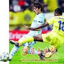 当地时间11月2日,曼城队球员席尔瓦(左)在比赛中带球突破。在欧洲冠军联赛A组第四轮比赛中,曼城客场以3:0战胜比利亚雷亚尔队。 新华社 发