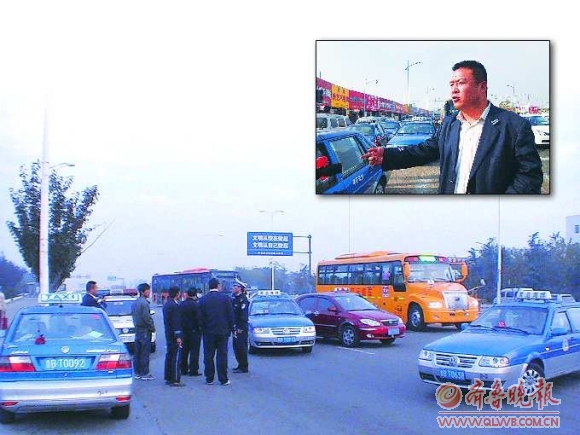 右图:青岛的哥梁斌讲述他们追堵肇事车的全过程。 本报记者 陈之焕 摄下图:哪里跑!的哥们把红色肇事车(圆圈内)围堵在路中央。 的哥庄景海提供A08?重点