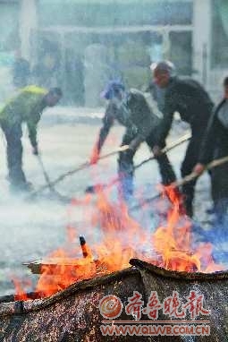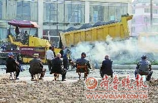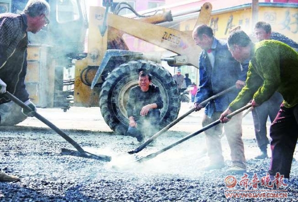 在热浪和刺鼻的气味中,平整刚撒下的沥青。
