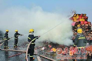 2日11时40分,京台高速禹城段369公里处,一辆大型货车在行驶中后轮胎突然起火,由于火势较大,熊熊烈火将货车上装载的3600箱杏仁干果食品引燃。禹城消防官兵紧急出动3部消防车,16名官兵,成功扑灭大火,为业务挽回近30万元的损失。 本报通讯员 姚浩 摄影报道