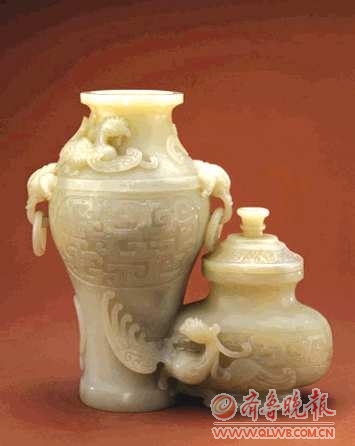 清,高27.4cm,长26cm,宽13.5cm。此尊玉色青白,无瑕斑及杂色。高、低二尊,下体相连。高尊圆口无盖,颈部环一凤,展翅似飞翔,腹上部较粗,浅浮雕夔龙纹,两侧各一象首,下套活环。低尊扁而宽,有椭圆形盖,上饰浅浮雕夔凤纹,宽腹,亦饰夔龙纹。两尊相连处亦雕一凤,与另一凤呼应。器底有篆书“大清乾隆年制”款。
