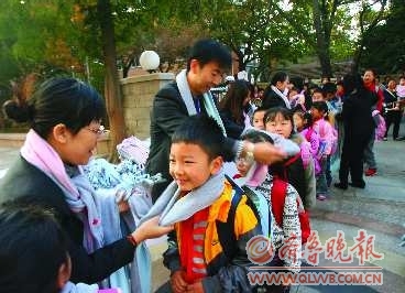 3日,在青岛嘉峪关学校,一进校门的同学收到老师送来的围巾。当日,青岛嘉峪关学校迎来58岁生日,由家长设计、学校定制的2000余条围巾送到学生手中,每条围巾都代表着学校对学生的期望和祝福,让学生在即将到来的冬天感受到温暖。