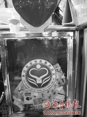 11月3日,记者在三角花园贵诚超市楼梯口看到,摆在在此的一个爱心募捐箱内除了五角、一角的爱心款之外,大都是传单还有一些豆浆盒等垃圾。 本报记者 李泳君 摄