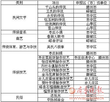 据介绍,此次入选的市级第三批非物质文化遗产名录共包括6个类别22个项目。其中,民间文学6项,传统音乐1项,曲艺2项,传统体育、游艺与杂技1项,传统技艺10项,民俗2项。滕州市推选的“千山头的传说”、峄城区“王良的传说”及市中区和山亭区推选的共6个非遗项目或民间文学非遗名录;市中区推荐的“枣庄小调”获传统音乐非遗名录;薛城区和峄城区推选的“鲁南大鼓书”和“峄县评词”获得曲艺非遗名录;同时市中区推荐的“齐村斗偶”制作技艺、齐村“砂陶制作技艺”及薛城区、台儿庄区等推荐的10个项目获得传统技艺非遗名录。