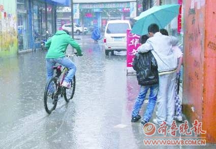 ▲很多学生放学后因没带雨具不得不几个人挤在一个伞下避雨。