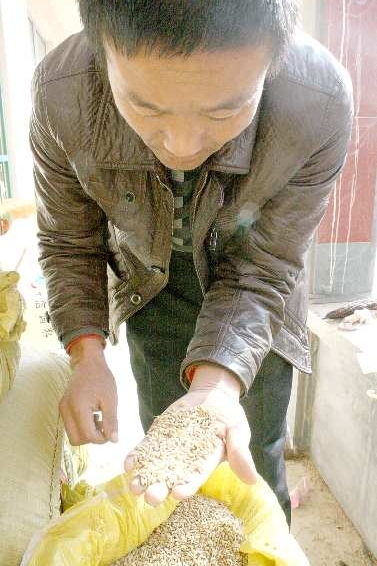 黄小荣丈夫在查看自家即将出售的水稻,因为稻秕多,减产的水稻以每市斤1.13元的价格卖出,比正常水稻便宜0.15元/斤。