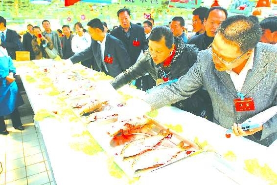与收银比赛同时进行的是宰杀活鱼比赛。13名选手从水缸中分别挑选活鱼,争取在最短的时间宰杀并处理干净。“别看就是杀一条鱼,要想获胜,必须遵循7个规则。”裁判员介绍说,除了用时长短,还要看鱼鳞是否清理干净、有没有刮破鱼皮、杀鱼腹部切口是否齐整、内脏和鱼鳃是否清理干净、操作中不能弄破鱼胆、是否将鱼清洗干净,不残留血污、鳞片等污物,“别看杀条鱼,学问可大了。”