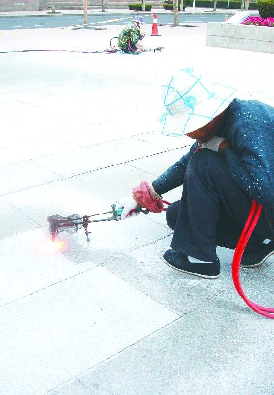 3日,记者在新世纪广场上看到,工作人员正在用气喷的方式对原本光滑的地砖进行粗糙化处理。工作人员告诉记者,“原本的地砖是滑面的,雨雪天气太滑,容易摔倒,处理成粗糙面后就会更安全了。”