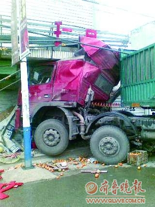 据目击者江先生介绍,3日中午12时许,他正在事发地附近一餐馆内吃饭,突然听到“哐当”一声巨响,跑出去一看,一辆红色的大货车一头扎进了路边的新华书店里,车头被死死地卡在门口,旁边的水果摊也被撞翻了,地上到处都是桔子。“当时货车驾驶室里有三个人,开车的是一名年轻男子。事发后,三人从窗户里爬了出来。书店里的人当时在里屋,只是受到惊吓。”江先生说,随后119、122先后赶到对现场进行处理。