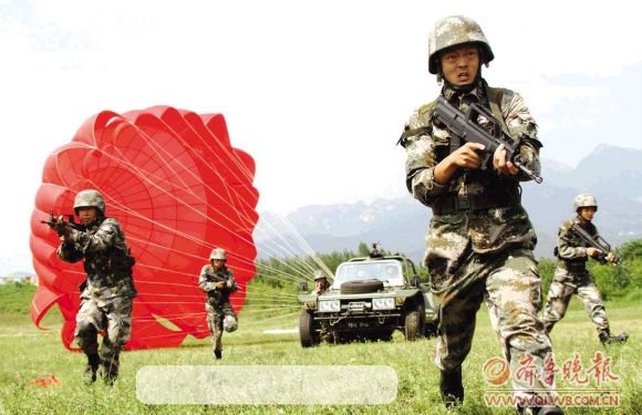 日、3日,记者走近这群新时期的钢铁战士,见证了他们的神勇和无畏。图为特种兵伞降突击训练。 通讯员 王峰 摄