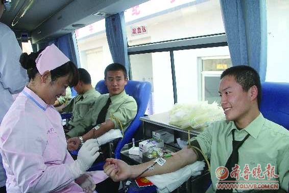 3日上午,在日照边防检查站,为表达对驻地人民的感激之情,日照边防检查站组织即将退伍的42名老兵无偿献血,这也许是这42人最后一次作为士兵无偿献血,一上午他们共献血16000余毫升。据悉,日照边防站每年都会组织这样的老兵献血活动。 本报记者 化玉军 通讯员 张成 摄影报道