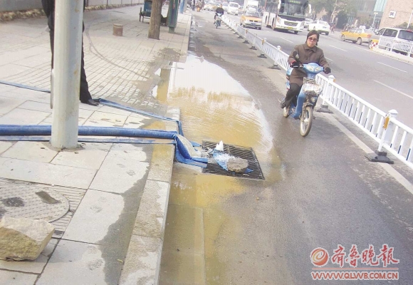 3日,在东岳大街与校场街交汇处,一处工地将污水排到马路上。泰安市城管执法局对工地下达整改通知,已基本解决。本报通讯员赵为民 摄
