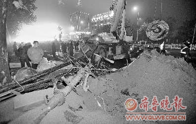 4日下午6点多,记者赶到位于章丘市双山大街与唐王山路交口附近的事发地点时,肇事的大货车刚刚被拖走。地上堆满了沙土,路灯杆被拦腰撞断,公交站牌已经严重变形,被埋在了沙子里。