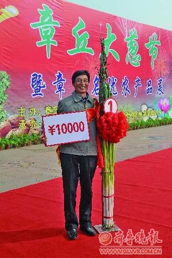 今年的章丘大葱“状元”高2.14米(资料片)。