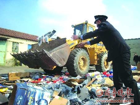 本报济南11月6日讯(记者 杜洪雷)随着铲车的开动,地面上众多伪劣的豆浆机、硒鼓、音响、机油桶等物品被碾碎。6日上午,济南市公安局在泉城广场和济南唐王造纸厂组织开展了“济南市公安机关决战‘亮剑’行动假冒伪劣商品集中展示和销毁活动”。