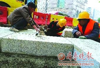 6日,泉城路改造试验段西段,工人开始安装新型石板。据介绍,为了承受巨大的公交车冲击力,试验段新铺的石板和水泥厚度高达40厘米。 本报记者 周青先 摄