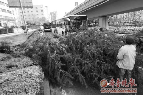 间,路过的301路车的女司机看到情况后,趁着路口等红灯的空档,叫了几名男乘客下来,想把松树挪开。因为松树太重,几人没能将它挪动。