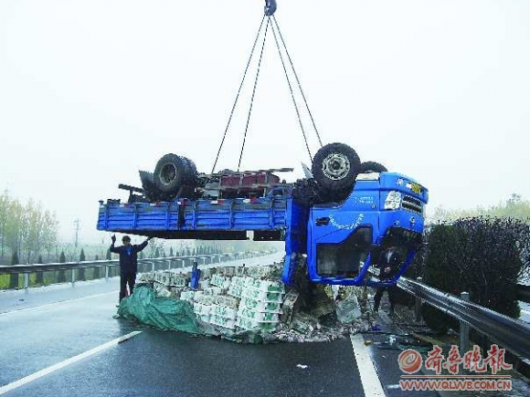 4日上午9点20分左右,一辆青岛籍货车在同三高速公路日照段行驶时,右后轮内侧轮毂破碎,车辆失去平衡。由于车厢货物较重,下雨路面湿滑,导致货车六轮朝天,3.2吨鲜海鱼扣在车厢下。货车前挡风玻璃破碎,车顶严重变形,一名驾驶员面部受伤。图为用吊车“拉”起货车。 本报通讯员 李炳德 孙丽萍 记者 彭彦伟 摄影报道