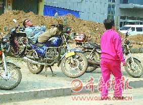 (孙守利 摄)时间:2011年10月30日 自述:男子倒睡在摩托车上,可真够悬的。点评:这样休息也需要功夫,但注意安全。