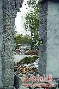 描述:安全出口的牌子被插在墙缝里。