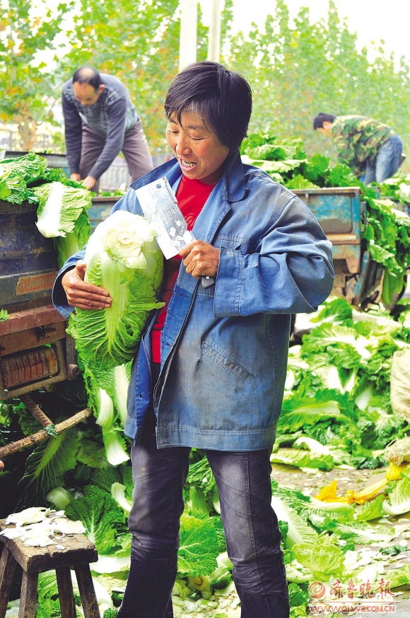 8日中午,五马汽车修理有限公司经理王兆朋等来到肥城市桃园镇伏庄蔬菜批发市场。天刚刚下过一阵小雨,批发市场上没有多少卖白菜的。“地里比较泥泞,白菜这么便宜,菜农这个点都不愿意下地收菜。”批发市场收购商王恒福说。等了半个小时,陆续有菜农从四面八方赶来。看到菜农要把一棵白菜外层的四五片叶子去掉,王兆朋赶忙制止。“不用剥这么干净,把白菜根去掉就行,白菜梆也能吃。”为了尽可能地帮助菜农,王兆朋决定以每斤五分钱的价格收购裸菜。“不去帮,直接装车,我们也省心,这样卖得快,能尽快把地腾出来种土豆。”菜农郭泗军说。不一会,五马汽车修理有限公司开来的130汽车就被摞得有一人高,现场采购5600斤爱心白菜。