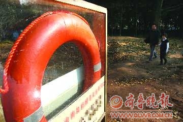 8日,在中山公园小西湖附近,游客从刚安装好不久的救生设备旁经过。据了解,为避免发生行人意外落水事故,同时便于落水者自救及岸上人员实施营救,相关部门在小西湖附近安装了防落水警示牌,而且每隔一段距离就放置了一套救生设备。