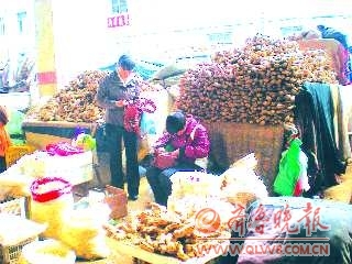 在威海市农副产品批发市场,姜贩老戚告诉记者,他收到的老姜价格在每斤2元左右,新姜的价格在每斤1元左右。