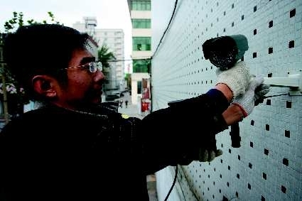 8日,在潍坊潍州社区内,工作人员正在楼上安装监控摄像头。因为潍州社区属于开放式社区,而且没有统一的物业公司,为了保证社区里居民的安全和防止盗窃案件的发生,为此社区安装上监控摄像头,保证居民的生活和财产安全。