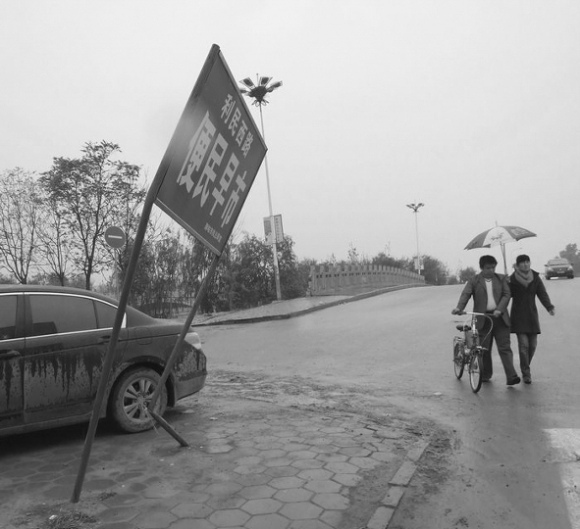 8日,城区利民西路运河桥附近,一个“便民早市”的标示牌倾斜严重,摇摇欲倒。附近商户说,标示牌靠近路口,可能是车辆拐弯或倒车时不小心撞弯的,希望有关部门能尽快处理,万一倒了伤到人就不好了。 本报记者 李璇摄