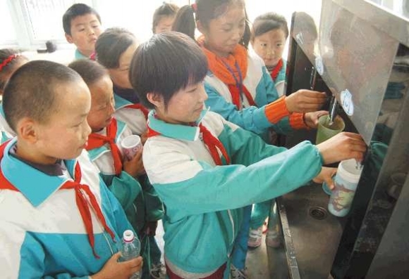 11月8日,在开发区东城街道办事处军王屯村小学,学生们趁课间时间正在学校的直饮机旁接热水喝。天气渐冷,开发区投资23万元为全区15所中小学安装了35台直饮机,2万多名中小学生喝上了热水。 本报记者 李军 摄影报道