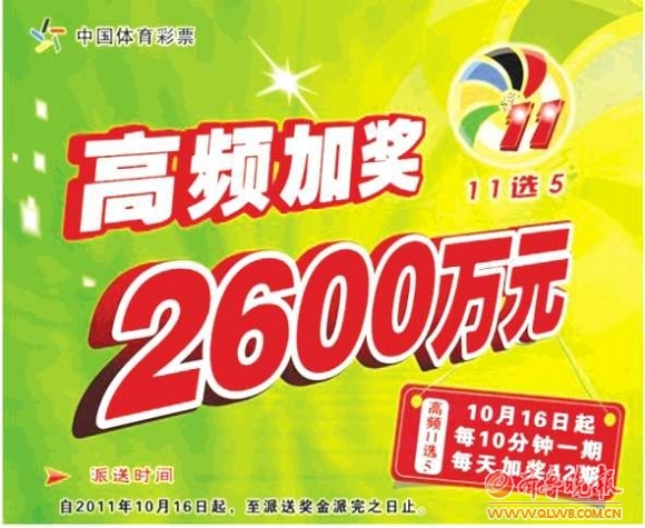 体彩高频“11选5”自上市以来,受到山东彩友的狂热追捧,在齐鲁大地上掀起投注热潮,万千彩友在流连于游戏乐趣的同时收获了不菲的奖金,真是一箭双雕。为回馈广大彩友对“11选5”的支持与厚爱,自2011年10月16日起,高频“11选5”已经开始了2600万元加奖大派送,每天加奖高达42期,引发了彩友的巨大热情,掀起了购彩新高潮。