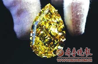 据美国媒体报道,英国索思比拍卖行当地时间11月10日宣布,一颗稀世梨形鲜彩黄巨钻将于本月15日在日内瓦进行拍卖,预计拍卖价格将超过1500万美元,买家将有权为这颗罕见珍宝命名。这颗巨钻重110克拉,有女士拇指那么大,是世界上已知最大的梨形鲜彩黄钻,被形象地称为“日落之钻”。经过专家鉴定,这颗黄钻具有彩钻中最高级别的“鲜彩”颜色,且净度达VVS1。