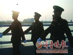2006年入伍,2008年担任胶州湾大桥护卫队员,这些大桥的守护者们见证了胶州湾大桥的落成和通车,他们每天仔细巡查着大桥的各个角落,处理大桥周边发生的各种突发事件,如今,其中的5名护卫队员要退役了,10日,他们最后一次来到胶州湾大桥,站好最后一班岗。