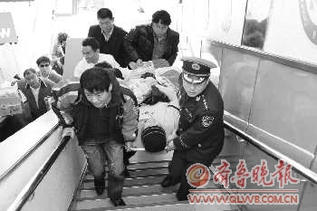 11月9日,青岛边检站开通“绿色通道”救助一名重伤韩籍商人。图为官兵与伤员家属合力将其抬上赴韩国的客货班轮“新金桥5号”。