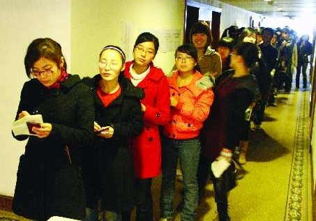 本报11月10日讯 (记者 孟君 展萍 通讯员 杨锦玲)10日,天很冷,可临沂饭店内却很“热”,这里是2012年全国硕士研究生报名确认现场,前来确认的考生排起了长龙。确认工作本该于8:00开始,7点刚过,就有人来排队了。据悉,研究生报名现场确认工作将持续到11月14日。