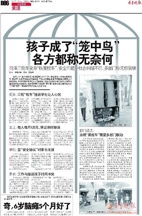 本报菏泽11月10讯(记者 田卉 崔如坤) 本报11月9日B06版《孩子成了“笼中鸟”》一文报道后,引发市民热议,两天来不少热心读者通过本报热线,对“铁笼校车”如何治理,学生安全如何保证表示关心,纷纷提出看法和建议。