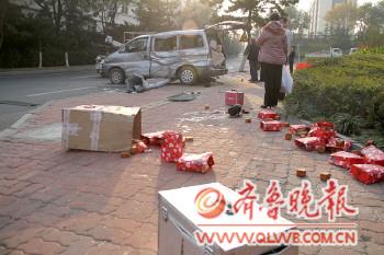 ◤面包车内的婚庆用品和设备从车内甩了出来,散落了一地。 本报记者 王震 摄 |