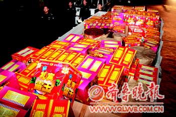 14日,济南天桥警方成功端掉一非法储存烟花爆竹的黑窝点,当场缴获烟花爆竹216箱。这也是济南今冬打击非法储存烟花爆竹端掉的第一个黑窝点。非法存储烟花爆竹的袁某被处以行政拘留5日的处罚,并依法收缴其储存的烟花爆竹。