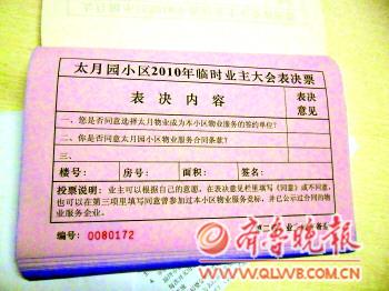 | 本报记者采访新天第嘉园业委会主任张大宪。 宋立山 摄 |  | 2006年6月,北京朝阳区新天第嘉园小区住宅维修资金从中国光大银行汇转入业委会在中国民生银行开设的账户。 宋立山 摄 |  | 北京海淀区太月园小区征求业主意见使用的表决票。 修从涛 摄 |  | 北京成立业主大会工作辅导中心,帮助各小区成立业委会。图为辅导中心刊物《新业主》。修从涛 摄 |  | ◤北京朝阳区新天第嘉园小区。 修从涛 摄 |