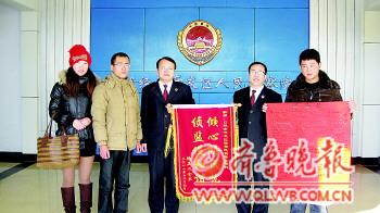 | 韩某和他的新婚妻子给日照开发区检察院送去感谢信和一面锦旗。 (日照开发区检察院供图) |