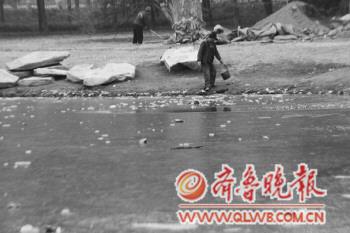 20日,在中山公园小西湖,进行公园改造的工人正在冰窟窿里打水搅拌水泥。据气象部门消息,21日,新一轮冷空气将再次到来,届时会带来大风和降温过程,部分地区还会有阵雪出现。 本报记者 张晓鹏 摄影报道