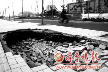 2月20日,在德州大学东路,一段人行道路面塌陷,形成面积约五六平方米,深约两米的大坑。 本报记者 马志勇 摄