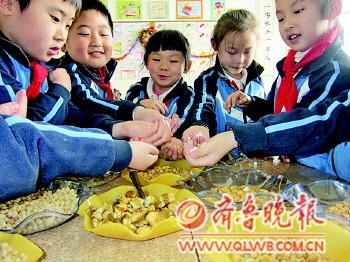 “二月二,龙抬头”,在传统节日二月二到来之际,东方双语实验学校、济南市青龙街小学等多所学校把民俗活动搬到课堂上,唱歌谣、吃料豆、画龙图、做纸龙……给孩子们上了一堂生动的民俗课。图为东方双语实验学校二年级3班的同学将各种各样的炒豆摆了一大桌,尽情品尝。 本报记者 李飞 实习生 胡慧 摄