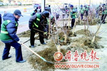 12日,在西北山旧货市场站点,为更好的绿化市区,高区园林工人在路两边植树绿化。据了解,本次植树400余棵,主要在道路两边的绿化带上种植,树种包括:紫薇树、木槿树、碧桃树等。 本报记者 王震 摄