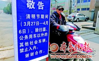 28日,记者在英雄山烈士陵园门口看到了“交通管制”的警示牌。扫墓期间,一般社会车辆禁止入内,保证扫墓活动顺利进行。