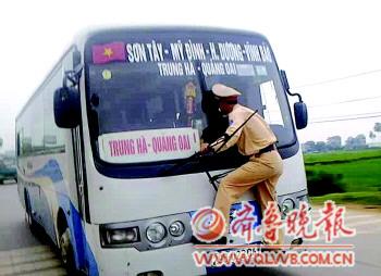 本报讯 据英国《每日邮报》13日报道,近日一位敬业的越南交警阮孟攀(音)在越南首都河内某公路上拦下一辆逆向行驶的大巴车。正当他准备依法开罚单时,却遭大巴司机冯洪方(音)的强烈反抗。为了躲避罚单,司机迅速回到驾驶座位上,并启动引擎准备逃逸。阮孟攀见状挡在车前,并顺势爬上了大巴前挡风玻璃,双手紧抓雨刷,并大声呼喊要司机立刻停车。然而,这名司机不但没停车,反而“挂着”交警在公路上行驶了1.6公里才放弃。冯姓司机最后被警方逮捕,并有可能面临袭警的起诉。 据《中国日报》